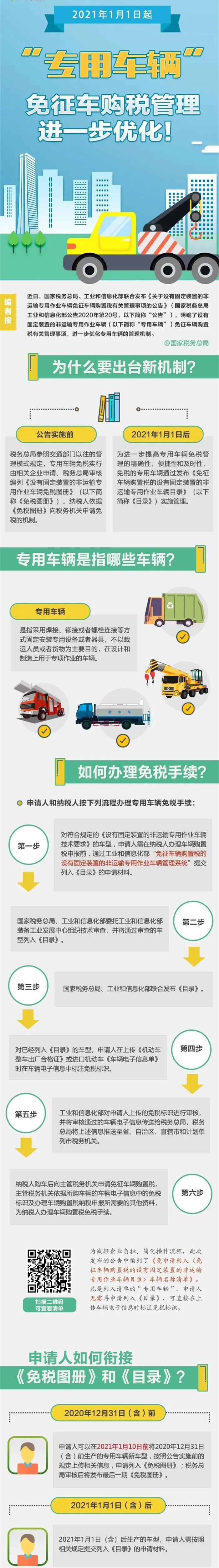 2021年1月1日起,我國(guó)將對(duì)免征車輛購(gòu)置稅的設(shè)有固定裝置的非運(yùn)輸專用作業(yè)車輛(以下簡(jiǎn)稱“專用車輛”),由原來(lái)的“《免稅圖冊(cè)》管理”改為“《目錄》管理”。為確保該項(xiàng)機(jī)制順利實(shí)施,稅務(wù)總局、工信部日前聯(lián)合發(fā)布《關(guān)于設(shè)有固定裝置的非運(yùn)輸專用作業(yè)車輛免征車輛購(gòu)置稅有關(guān)管理事項(xiàng)的公告》(國(guó)家稅務(wù)總局 工業(yè)和信息化部公告2020年第20號(hào)),明確若干管理事項(xiàng)。消防車屬于專用車的一種,也屬于免征車輛,以下要點(diǎn)需要納稅人關(guān)注↓